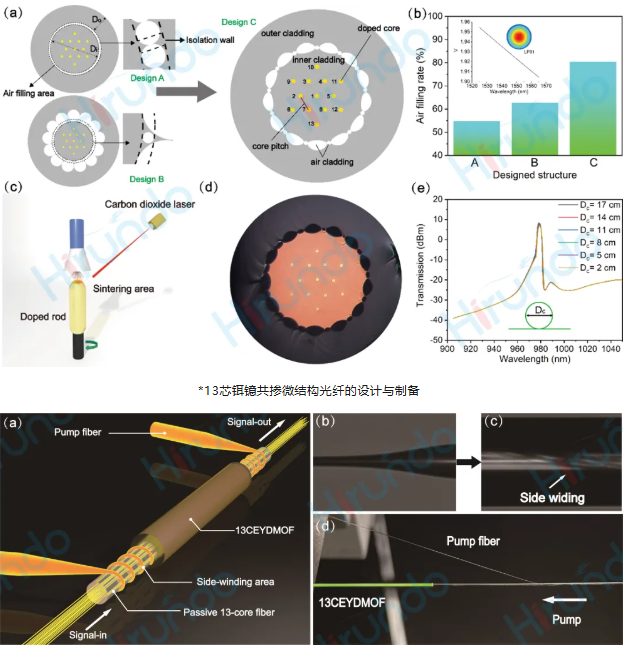 为了实现多芯光纤放大器在性能上的平衡、高效、小型化和成本效益,我们提出了一种创新的三层包层13芯Er/Yb共掺微结构光纤(13CEYDMOF)。