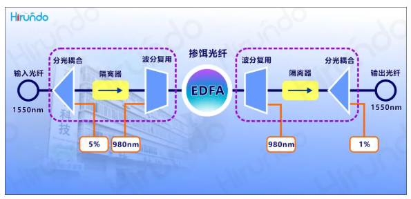 掺铒光纤放大器EDFA, Erbium Doped Fiber Amplifier, 是使用掺了稀有金属铒的成分的光纤制作而成的光学放大器。在DWDM光纤通信线路上,需要用大量的掺铒光纤放大器来提高信号光的无中继传输距离。