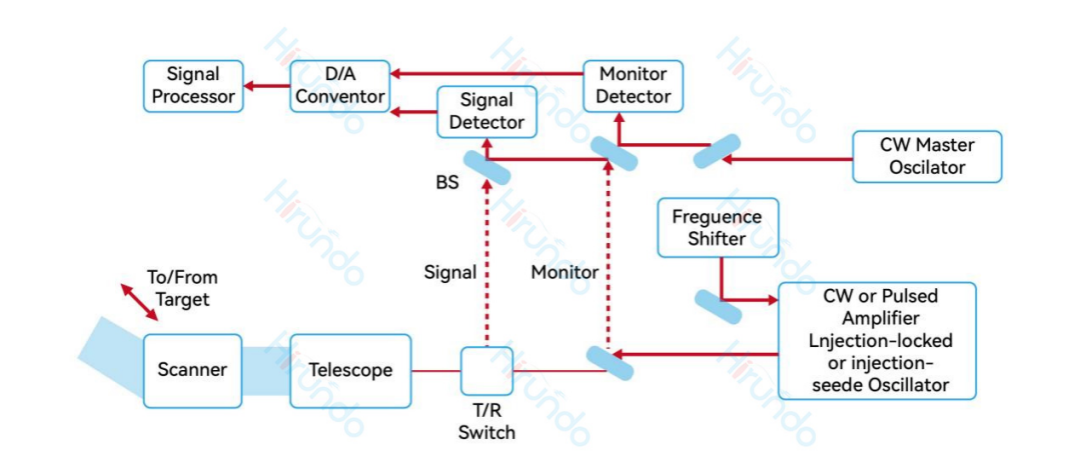 单频窄线宽光纤激光器在激光雷达或激光测距系统中也有非常重要的应用。使用单频窄线宽光纤激光器作为探测光源,结合光相干检测,就可搭建长距离(数百公里)的激光雷达或测距仪。这种原理与光纤中OFDR技术具有相同的工作原理,因此不仅具有非常高的空间分辨率,而且能增大测量距离。这种系统中激光光谱线宽或者说相干长度决定了距离测量范围和测量精度,因此光源的相干性越好, 整机系统的性能就越高。